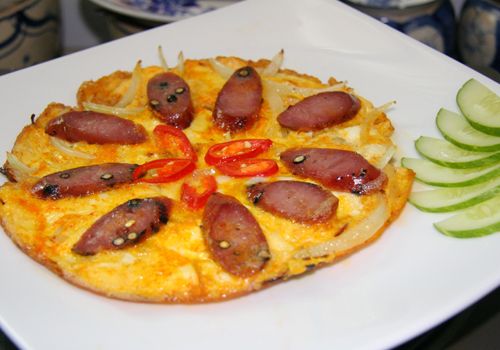 – Heat fragrant oil, add thinly sliced onions and sauté until golden. Next, fry the eggs until they turn golden. Arrange the previously fried Chinese sausage on the egg surface. Transfer the fried eggs to a plate and enjoy with hot rice.
