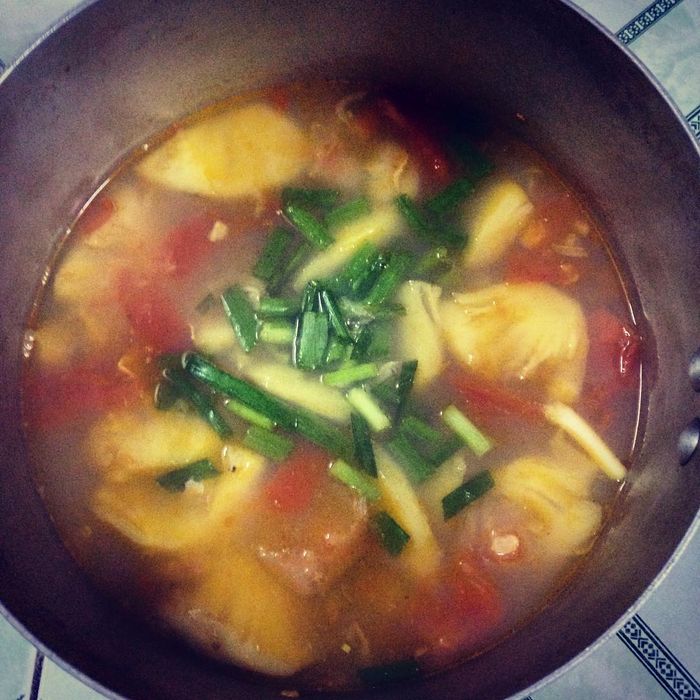 Next, add the pineapple and cook until it's slightly tender, then add the tomatoes. Wait for the soup to boil again, and it's done.