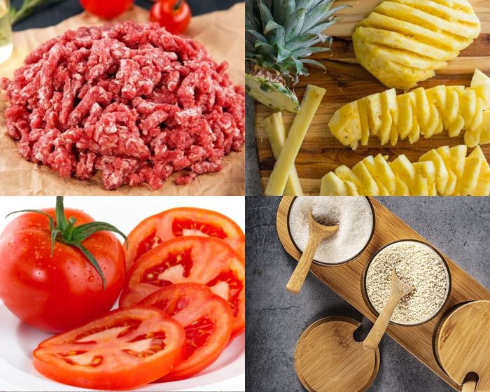 After purchasing minced meat, rinse it in boiling water and skim off any foam to remove impurities. Cut the tomatoes into wedges and the pineapple into small triangular pieces.