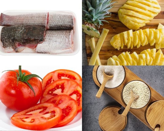 Once the water boils, add the fried snakehead fish and spices to the pot in the following proportions: 15g seasoning powder, 15g fish sauce, 6g salt, 80g sugar, 120g tamarind juice. Continue to simmer for about 10 more minutes until the fish is cooked, then remove the fish into a bowl. Next, add the tomatoes, corn, and pineapple to the pot and wait for it to boil again before turning off the heat.