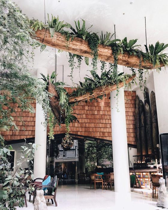 Bason Cafe, situated on the ground floor of The Myst Dong Khoi hotel, boasts a sleek design with white tones, exuding an air of luxury. The highlight is a 1500-year-old fossilized wood and massive wooden panels securely hung from the ceiling. Bason Cafe also offers an outdoor space resembling a cool garden, providing a tranquil and comfortable atmosphere for visitors.