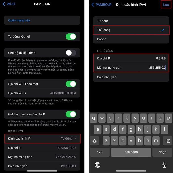 Step 2: Select IP Configuration > Choose Manual > In the IP Address section, enter 8.8.8.8, In the Subnet Mask section, enter 255.255.0.0 > Press Save.