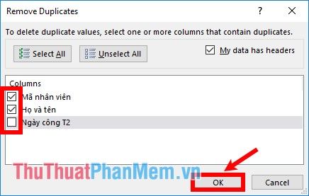 Step 3: When Remove Duplicates appears, select the fields (columns) where if data is duplicated across rows, it will be deleted entirely. Then press OK to delete.