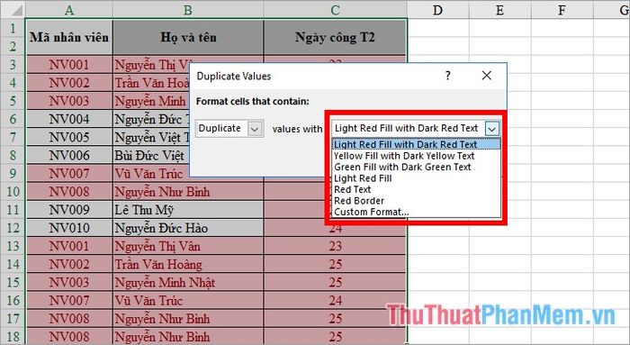 Step 3: In the Duplicate Values dialog box, choose how you want to mark the duplicate values under values with.