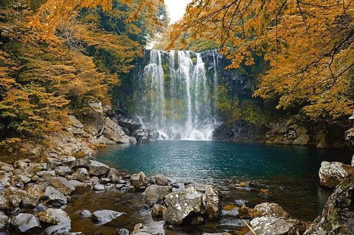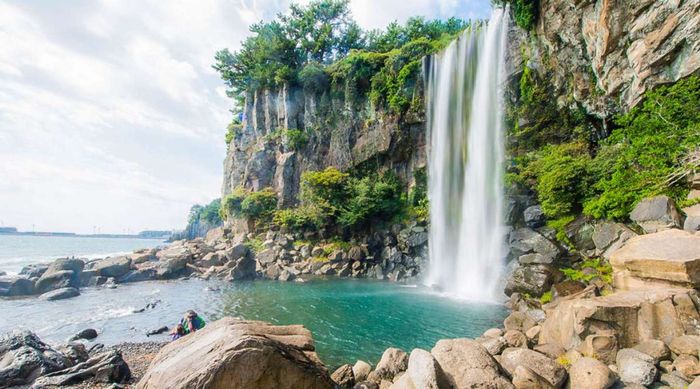 Cheonjiyeon Waterfall is one of the famous landmarks on Jeju Island. The waterfall is dubbed the “Pond of the Gods,” standing approximately 22 meters high and about 12 meters wide, surrounded by lush vegetation. The cascading water creates a picturesque scene, a majestic sight rarely seen elsewhere.
