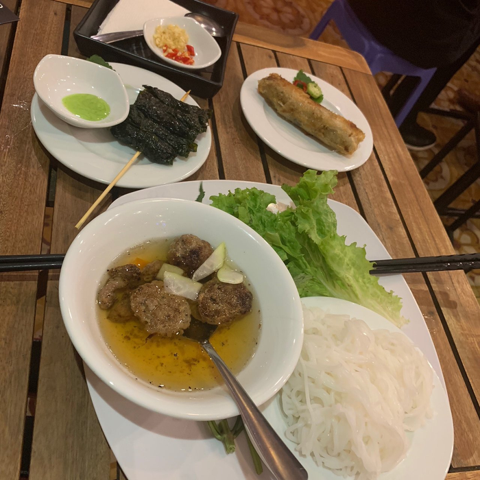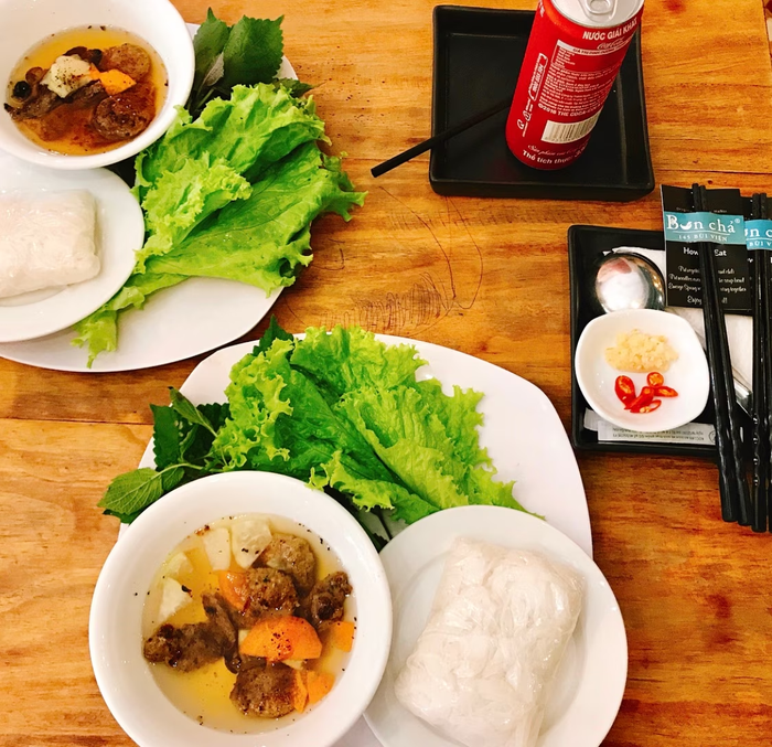 The bun cha here is similar to other places, with delicious tender grilled meat, packed meatballs, flavorful dipping sauce, and fresh green vegetables. Besides bun cha, the restaurant also serves crab spring rolls and seafood spring rolls, giving you plenty of options.