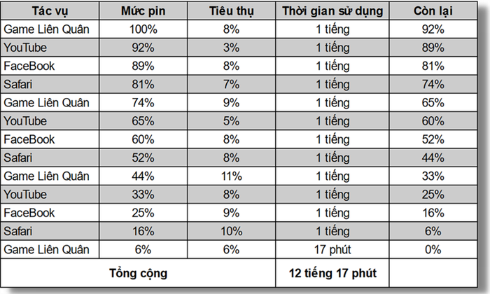 Measuring the battery life of the iPhone 13 Pro MaxThe iPhone 13 Pro Max is equipped with a quite impressive 4,352 mAh battery. With a usage test involving various tasks such as playing Arena of Valor, watching YouTube, and browsing Facebook, the battery of the iPhone 13 Pro Max can last up to 12 hours and 17 minutes.