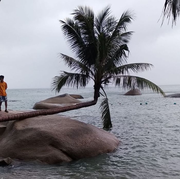 Uniquely growing coconut tree on a rocky outcrop