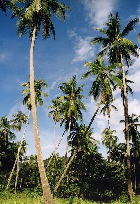 Coconut trees stretch towards the sea