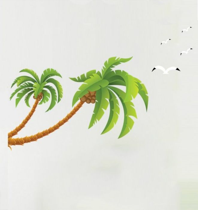 A depiction of a towering coconut tree alongside graceful birds