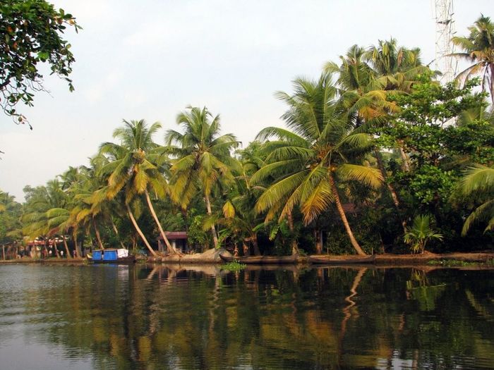 Coconut trees growing closely together around the lake