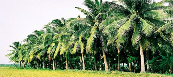 Coconut tree rows planted along the coastline look incredibly beautiful