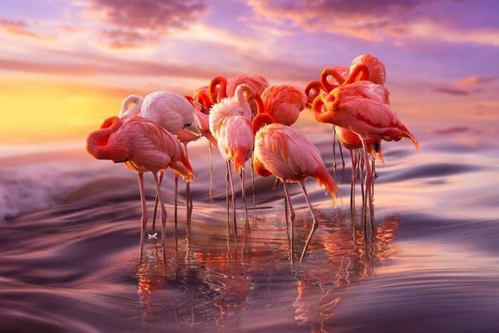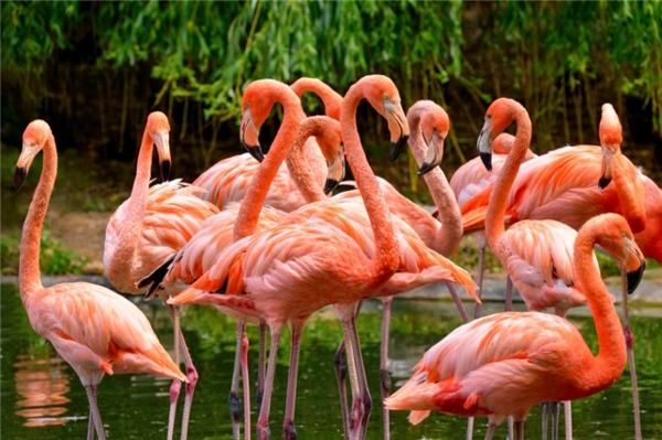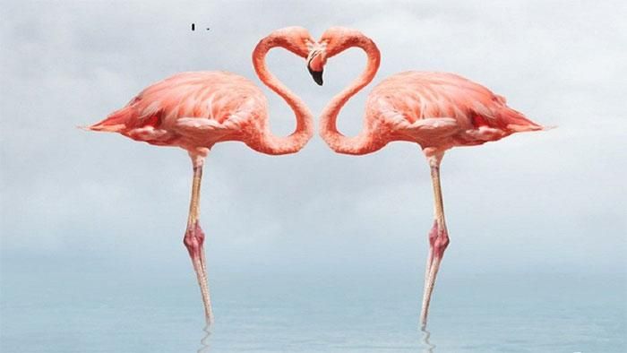 Flamingos often gather in large flocks to forage, living in shallow waters, with feather color depending on daily diet. They are considered one of the most faithful animal species. Birds in the same flock will move together when encountering threatening dangers. When a research plane approaches the nesting area of a flamingo flock in Sisal, Mexico, the birds move together to a safer place without dispersing individually.