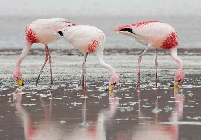 To feed, flamingos will stir up the bottom of the lake with their feet and plunge their bills into the mud and water to find food.