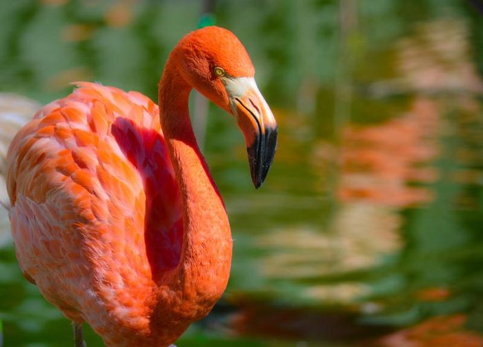 Flamingos are large birds identifiable by their long necks, stick-like legs, and pink or red feathers. They epitomize the saying “you are what you eat.” The pink and red hues of flamingo feathers come from pigments in algae and invertebrates.
