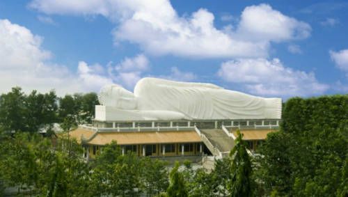 Also boasting a unique rooftop statue, Hoi Khanh Pagoda in Thu Dau Mot, Binh Duong, holds the record for the longest reclining Buddha statue on its roof in Asia. With dimensions of 52 meters in length, 12 meters in height, and lying 24 meters above the ground, it is also the longest reclining Buddha statue in Vietnam. The pagoda is not only a place of worship but also a center for Buddhist study in the region.