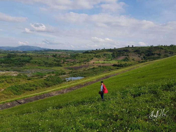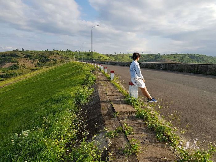 Instead of majestic waterfalls cascading from above, the Ba Hạ River Hydroelectric Dam presents us with a gentle yet romantic beauty, with the dam ridge covered in clusters of small, delicate white daisies against lush green grass.