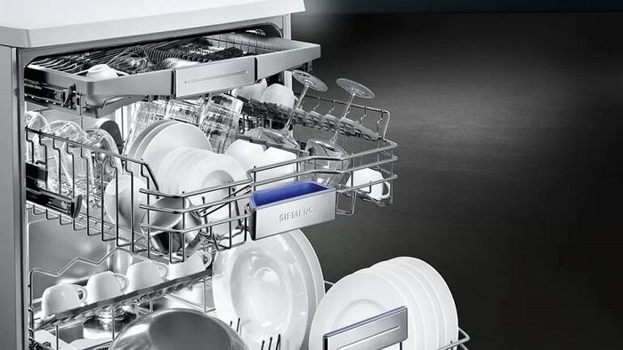Siemens dishwashers operate quietly, without disrupting household activities. Each dishwasher cycle typically consumes about 9.5 liters of water and a small amount of electricity. This water and electricity usage can fully clean 14 place settings, helping you save a significant amount of money.