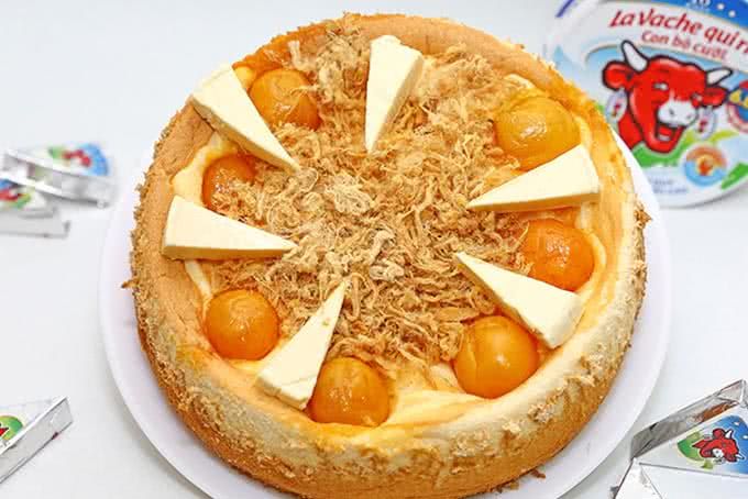 - Pour the mixture into the baking tray, filling only about 2/3 of the tray as the batter will expand when baked. Place half of a salted egg yolk and ½ piece of cheese on top of the cake, cover the cake surface with shredded pork floss.