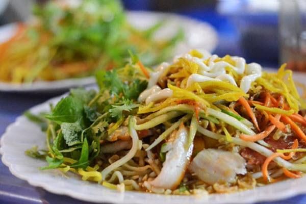 The process of making Stitched Delight is intricate and time-consuming. The thick slices of pork belly are marinated with various spices and folded. During steaming, sweet potatoes, and shredded Chinese potatoes are added. Stitched Delight pairs well with sticky rice, regular rice, or bread. Sliced taro, fried to a golden brown, is arranged on a plate. Below the layer of taro is a savory mixture of finely chopped shredded Chinese potatoes, combined with soybean paste, sesame oil, star anise, and garlic. The meat is then thinly sliced, placed in a large bowl, flipped over to keep the skin on top, and arranged in a pot to steam for about 4-5 hours until the meat is tender. When serving, flip the bowl of meat onto a plate, ensuring the skin is displayed on top. If it has a uniform golden color and a distinctive aroma, it meets the requirements. Stitched Delight can be enjoyed with rice or sticky rice, but it is best with crispy rice cakes. This dish is widely available in Dong Kinh market and various eateries, making it a popular gift for tourists.