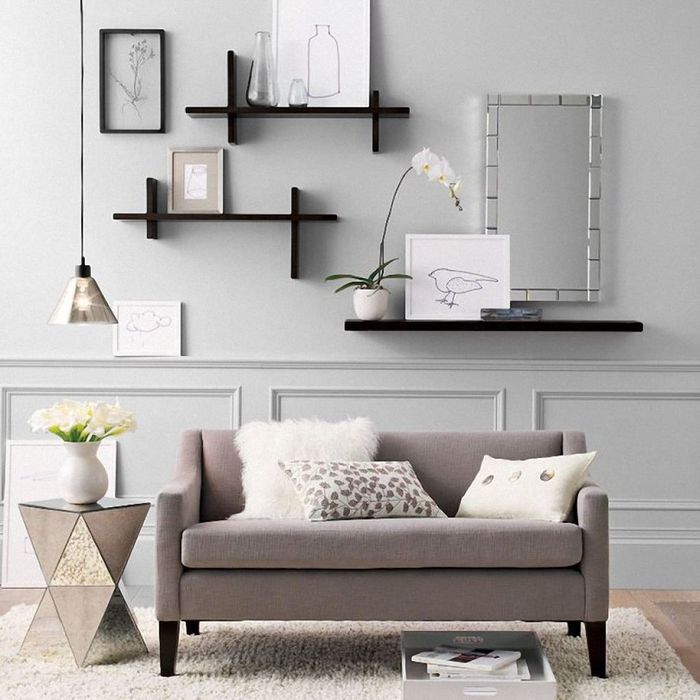 In addition to serving as storage for items, wall-mounted shelves also have a decorative function (Source: Internet)Decorate the Living Room Wall with Feng Shui and Art Paintings