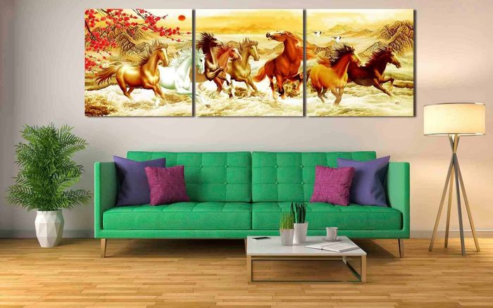 Hanging paintings on the wall is an excellent way to create a focal point in the living room. Choose artworks with themes and colors that complement the home's design style, achieving a harmonious and impressive overall look. Feng shui paintings are considered an effective way to bring luck and prosperity to homeowners. Select artworks based on the homeowner's Chinese zodiac sign to enhance health, wealth, and prosperity.