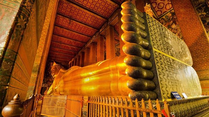 Wat Pho stands out as the most talked-about temple in Bangkok, boasting the title of the largest temple in Thailand with an area of 80,000m2. Located at 2 Sanamchai Road, Grand Palace Subdistrict, Wat Pho is divided into two main sections. The southern area is the monastery of the monks within the temple. The northern area is home to a traditional massage school and the 46m long and 15m tall reclining Buddha statue. Notably, the reclining Buddha statue attracts many visitors not only for its gold plating but also for the 108 auspicious scenes adorning its feet.
