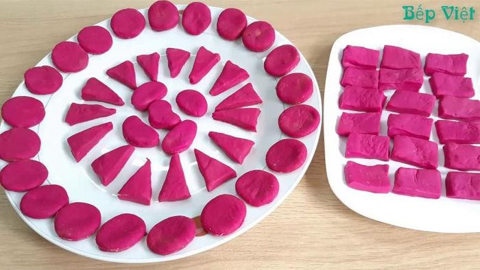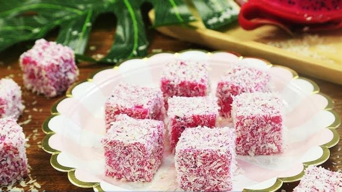 - Sprinkle shredded coconut evenly on a plastic box or plate. Pour the cooked dragon fruit mixture onto the tray and spread evenly. Then, place the cake tray in the refrigerator and let it sit overnight.