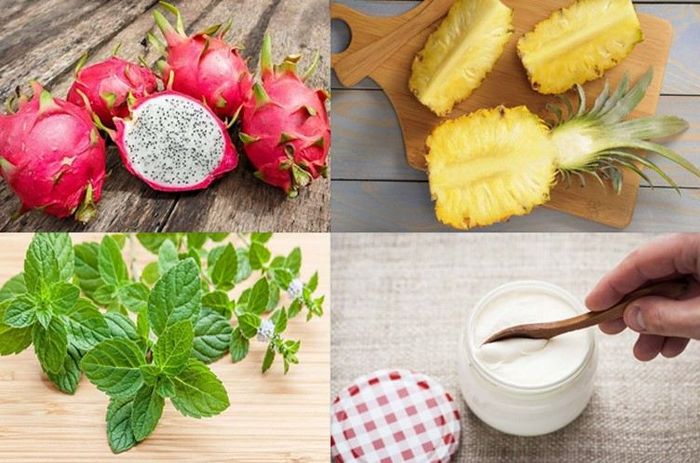 - In a blender, add the dragon fruit, pineapple, unsweetened yogurt, white sugar, and 1 mint leaf. Blend all the ingredients together and add crushed ice. Continue blending until smooth.