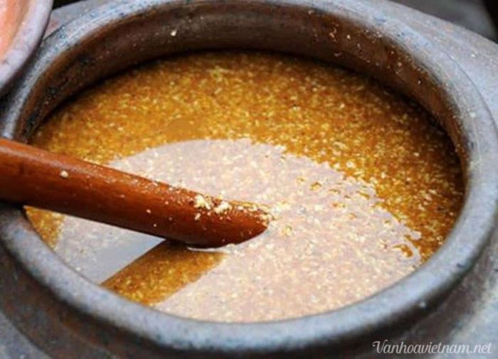 Speaking of specialty foods in Bac Ninh, one cannot overlook Dinh To Soy Sauce when mentioning peanut sticky rice cakes. Unlike other types of soy sauce, Dinh To Soy Sauce is made primarily from corn. To create delicious Dinh To Soy Sauce, careful selection of corn kernels is essential. The chosen kernels must be red, shiny, high-quality, evenly yellow, fragrant, and firm. The corn is then dried, cleaned, mashed, and naturally fermented for about half a month.