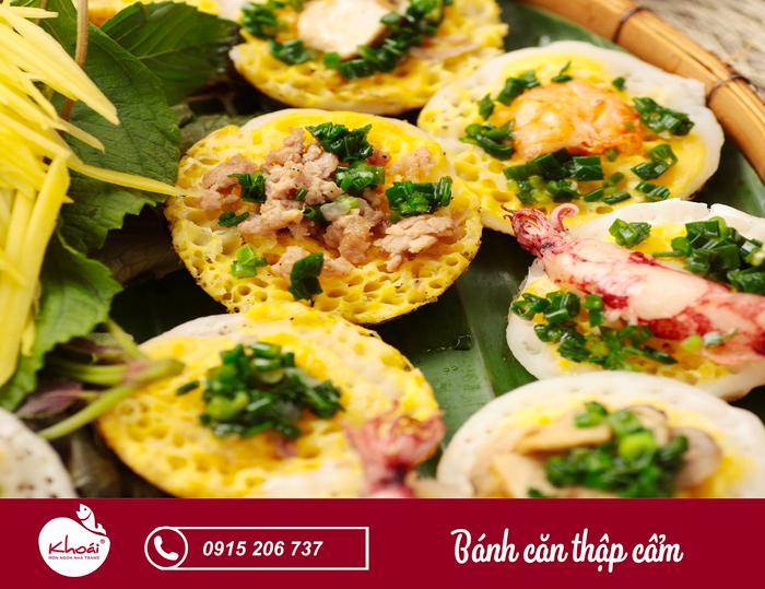 Bánh căn is a rustic specialty dish from the South Central Coast region, made from rice flour, similar to bánh khọt. When cooked, two pieces of bánh are folded together, filled with toppings, and garnished with finely chopped scallions in the center.