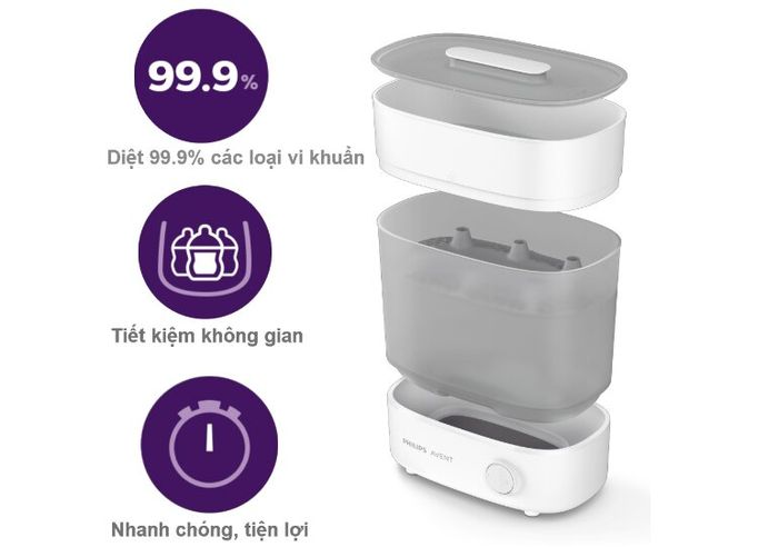 The Avent Starlight SCF291/00 milk sterilizer, with its eye-catching design and multiple functions, will effectively eliminate up to 99.9% of harmful bacteria in just 10 minutes. There are various ways for you to sterilize and dry baby bottles and accessories quickly by assembling full-size 2 large compartments or independently each small compartment suitable for the number of bottles needed to be sterilized from 1, 2 bottles to a maximum of 6 wide-neck bottles.