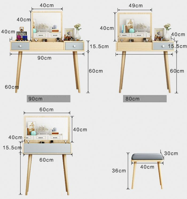 - Size: Ensure the vanity table fits well in your room and meets your usage needs. For those interested in a mini vanity table, here are the standard dimensions to consider: