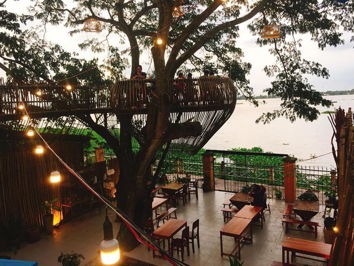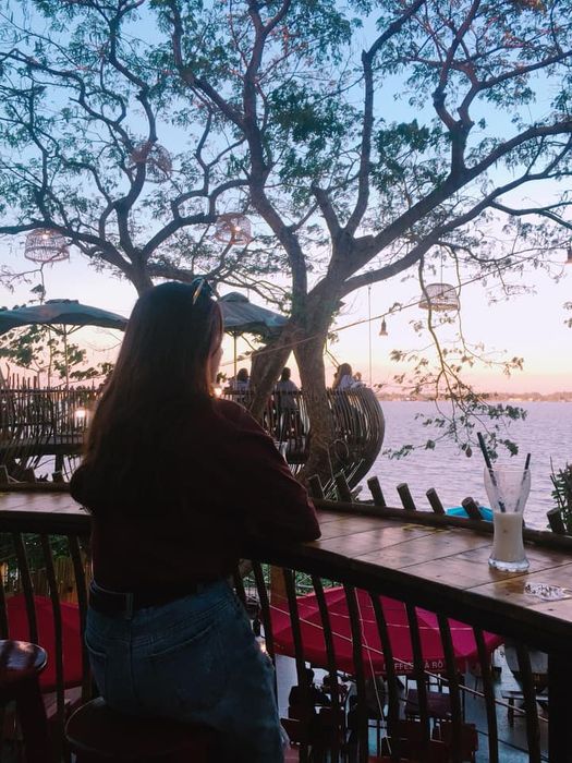 This Cần Thơ coffee spot sits right next to Sông Hậu Park, showcasing bamboo arches intertwined with trees, scattered leaves... Whether you visit on a hot sunny afternoon or a cool evening, you can feel the refreshing ambiance. With numerous beautiful corners, patrons enjoying coffee or a meal can simultaneously admire the serene river and capture beautiful moments.