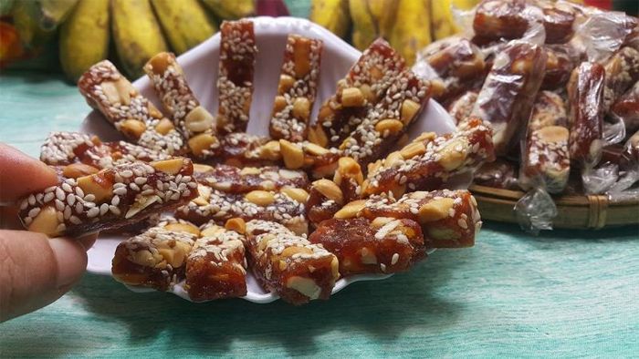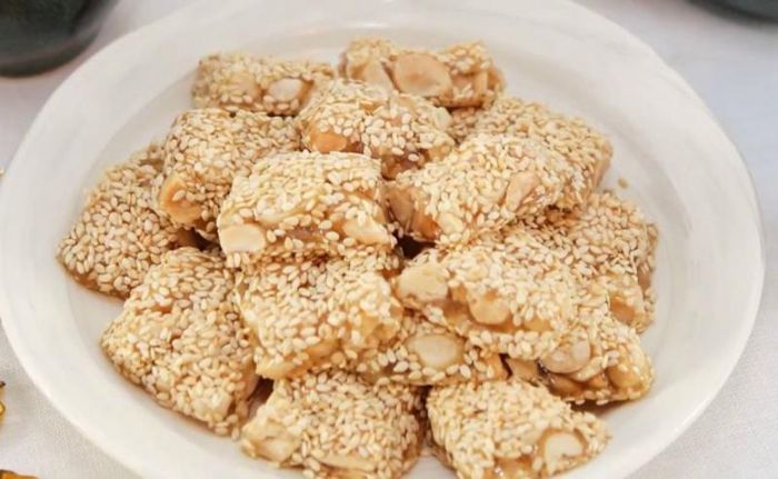 - Step 4: Place a layer of food wrap on a baking tray, brush with cooking oil, and sprinkle sesame seeds. Pour the candy onto the tray and spread it evenly. Press the candy surface tightly, then sprinkle another layer of sesame seeds on top. Place another layer of food wrap on the candy surface, use a rolling pin to roll and flatten the candy.