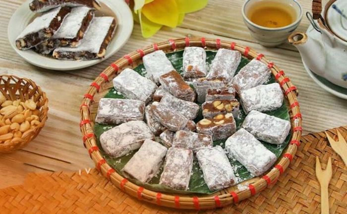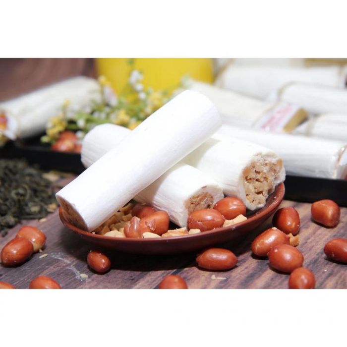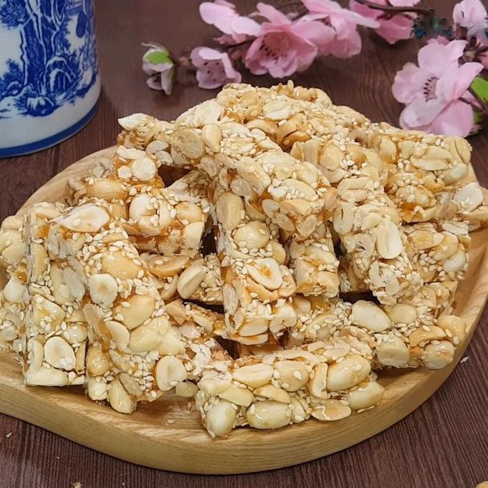 - Step 4: Pour the excess flour onto the table and mix it with the mixture just cooked to warm it. Then add roasted peanuts and quickly knead the dough. After kneading well, put them into a mold, then wait for them to cool before using a knife to cut them into small, bite-sized pieces.