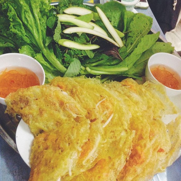 Cô Hai's bánh xèo boasts an exceptionally thin, crispy golden crust that is incredibly fragrant and delightful to the palate. Inside, it's filled with a savory mixture of meat, shrimp, and bean sprouts. The rice paper is pre-cut by the owner, making it easy for diners to roll the bánh xèo with fresh green herbs. Dip it generously into the sweet and tangy dipping sauce with shredded papaya and carrot for an exquisite taste experience.