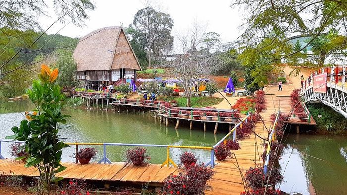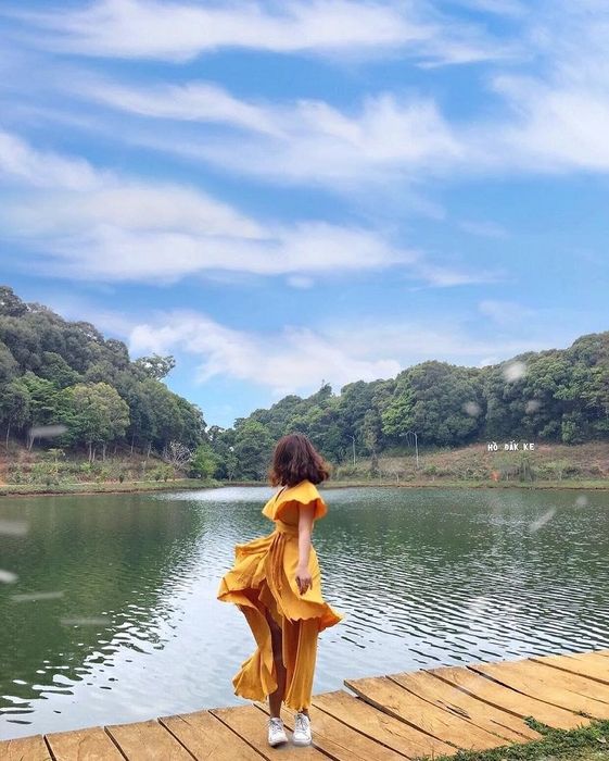 Đăk Ke Lake boasts pristine surroundings, surrounded by mountains and lush forests, with vibrant flower bushes. At the Đăk Ke Lake tourist area, there are plenty of entertaining activities such as boating, water cycling, camping, and more.