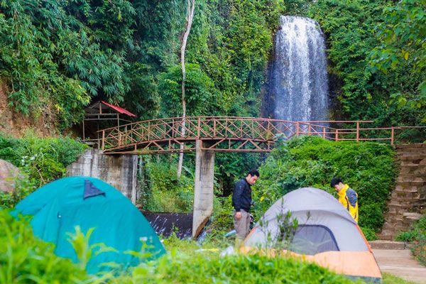 Moreover, the scenery here is further enhanced by the presence of blooming flowers scattered at the foot of the waterfall, simple tents and houses built around the tower serving as resting shelters, observation decks for visitors, and rustic pathways leading amidst the stream where the waterfall cascades down.