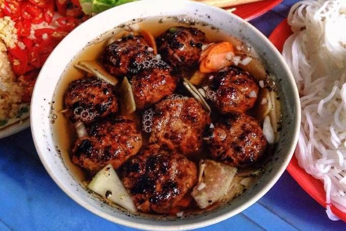The authentic way to enjoy Hanoi's Bún Chả by dipping vermicelli and meatballs separately into the dipping sauce