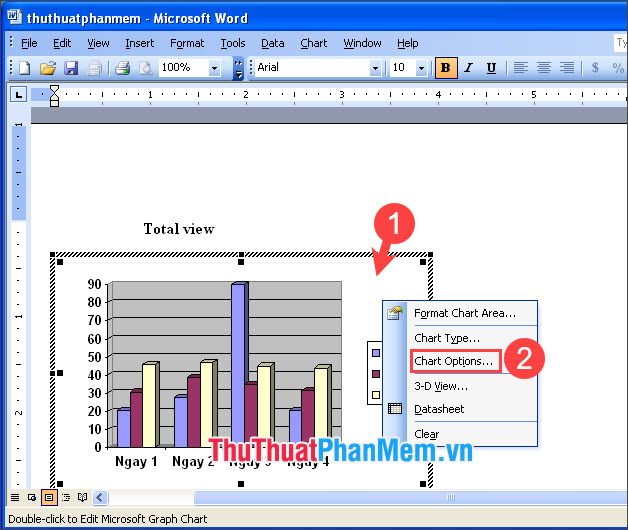 Step 1: Double-click on the chart to enter edit mode. Then, right-click on the white chart area (1) => Chart Options… (2).