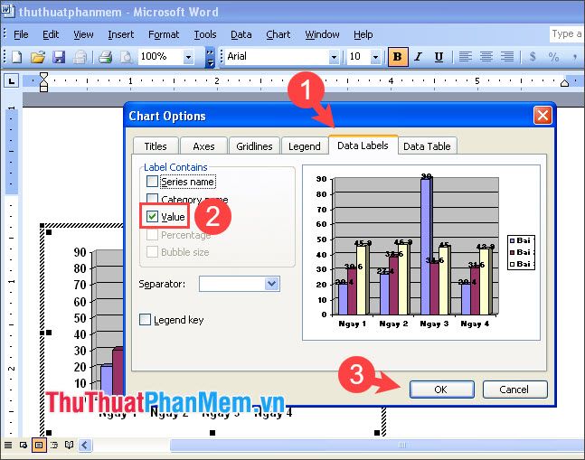Step 2: Go to the Data Labels (1) tab => check Value (2) => OK (3).