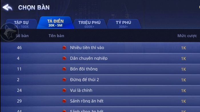 Access 'Play Now' or 'Choose Table'.Step 3: If you click on 'Choose Table', a list of available rooms will appear. Note that you should choose a room within your capabilities and conditions. After selecting a suitable room, click on the room's row and press the 'Ready' or 'Start' button to enter the Tiến Lên game and play with friends nationwide.