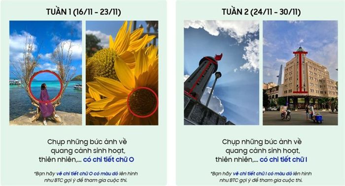 Themes for week 1 and week 2.For week 1 with the letter 'O', you can think of details with circular shapes like flower petals, wheels,... then draw the letter O based on that detail. Week 2 with the letter 'I', you can choose to capture buildings, lighthouses,... details with vertical shapes and draw the letter 'I' accordingly.