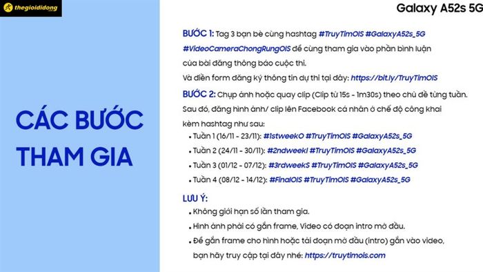 Don't hesitate anymore, join the Truy tìm OIS - Galaxy A52s 5G Contest directly on The Gioi Di Dong's Facebook page now!