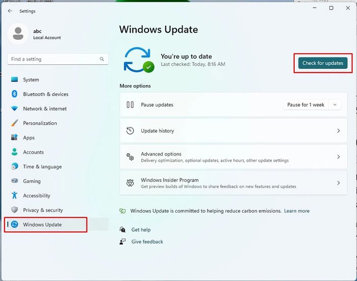 At the app window, in the top-left corner, access the Windows Update tab, then click on check for updates on the right. Windows will immediately automatically check for the latest updates on your device.