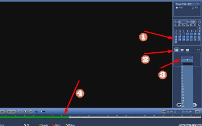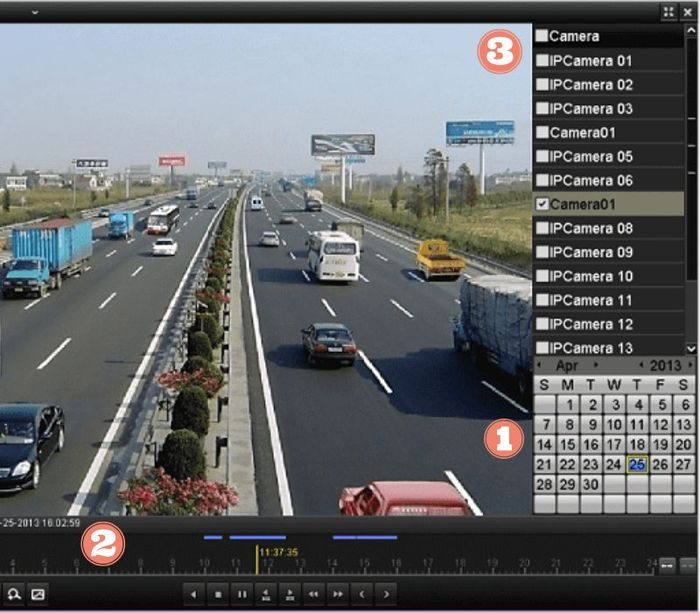 Step 2: The interface will appear as illustrated below, including tables to select date (1), time (2), and cameras in the system (3).