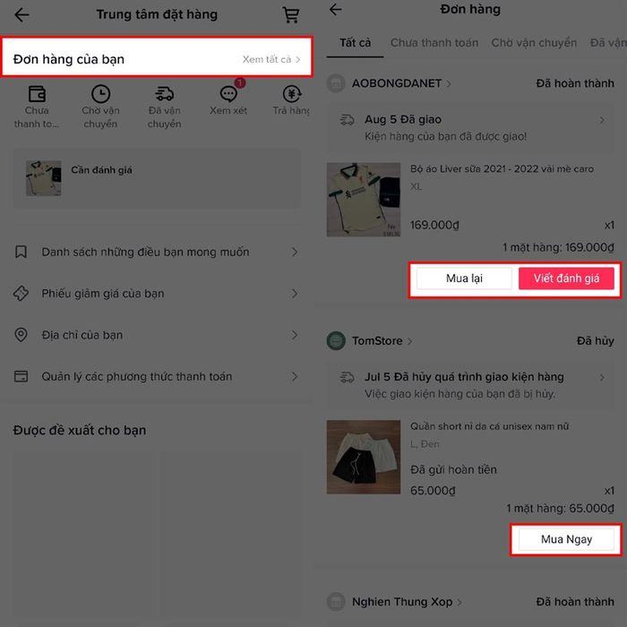 Step 3: You'll then be directed to the TikTok Shop Order Center. To view your placed orders, simply click on View All under Your Orders section. You'll see successful, failed, and cancelled orders along with reasons for cancellation. If you wish to repurchase past orders, hit the Rebuy or Buy Now button to place your order again.