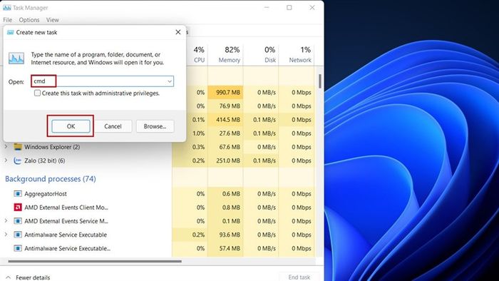 Step 3: The Create new task dialog appears > Type cmd > Press OK.