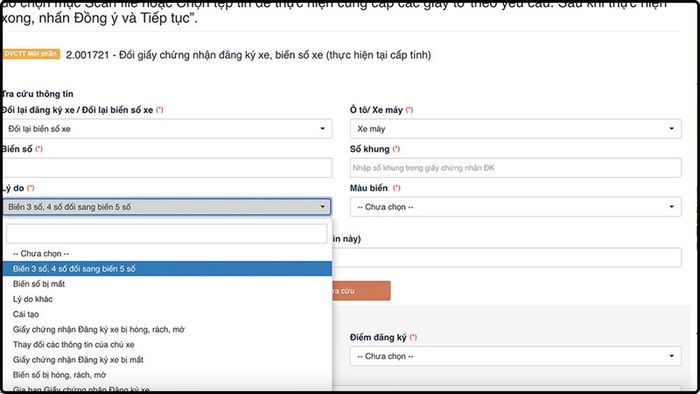 Step 4: Now you'll be directed to fill in the information > next, fill in your vehicle information > then in the reason section, select changing from 3 or 4 digits to a 5-digit plate > then click search to conduct a vehicle result inquiry.